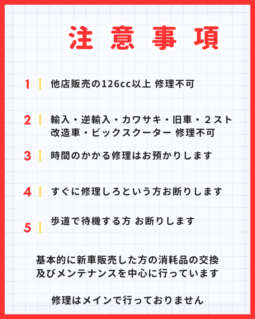 修理をメインとしたバイク店ではございませんので